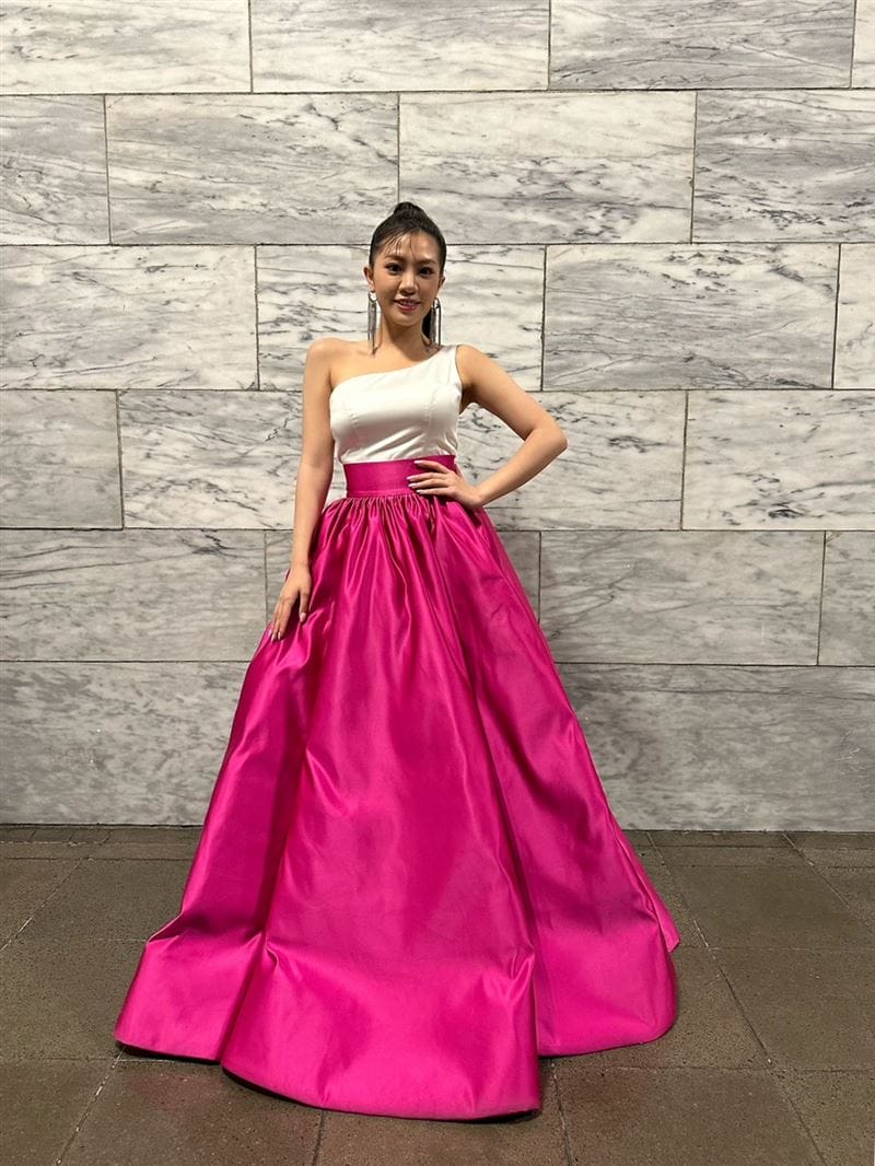穿著上身白色、下身桃紅色禮服,